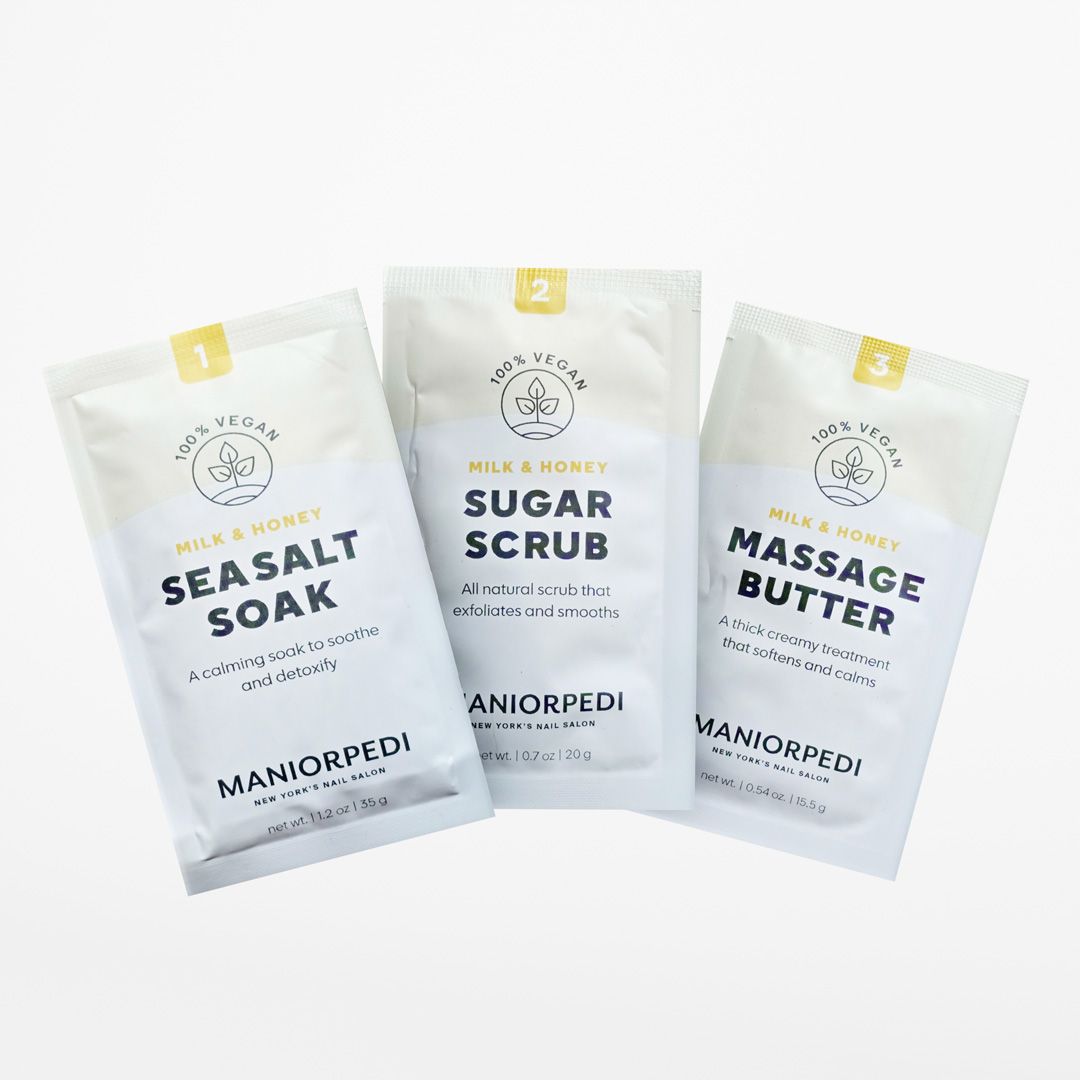 The MANIORPEDI 3 Step Peidcure Kit is the most hygienic single-use product available on the market. This kit includes a sea salt soak, sugar scrub, and massage butter, leaving your feet feeling happy and smooth. Whether for at-home use or for your customer, our product is designed to eliminate dryness, regnerate healthy skin, and deliver a moment like no other. Our ingredients are all natural, cruelty-free, and 100% VEGAN to meet the needs of all skin types.